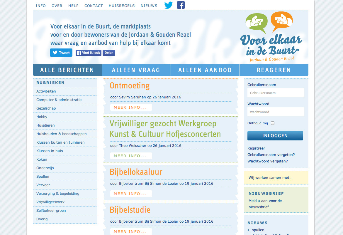 ‘Voor elkaar in de Buurt’ is er voor bewoners met een vraag of aanbod in de Jordaan en Gouden Reael. X41 ontwierp en programmeerde de website.